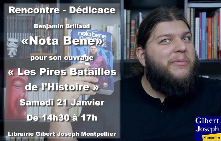 Venez rencontrer Benjamin Brillaud, plus connu sous le pseudonyme "Nota Bene", le célèbre vidéaste vulgarisateur de l'histoire, à l'occasion d'une rencontre-dédicace pour son premier livre "Les pires batailles de l'histoires".