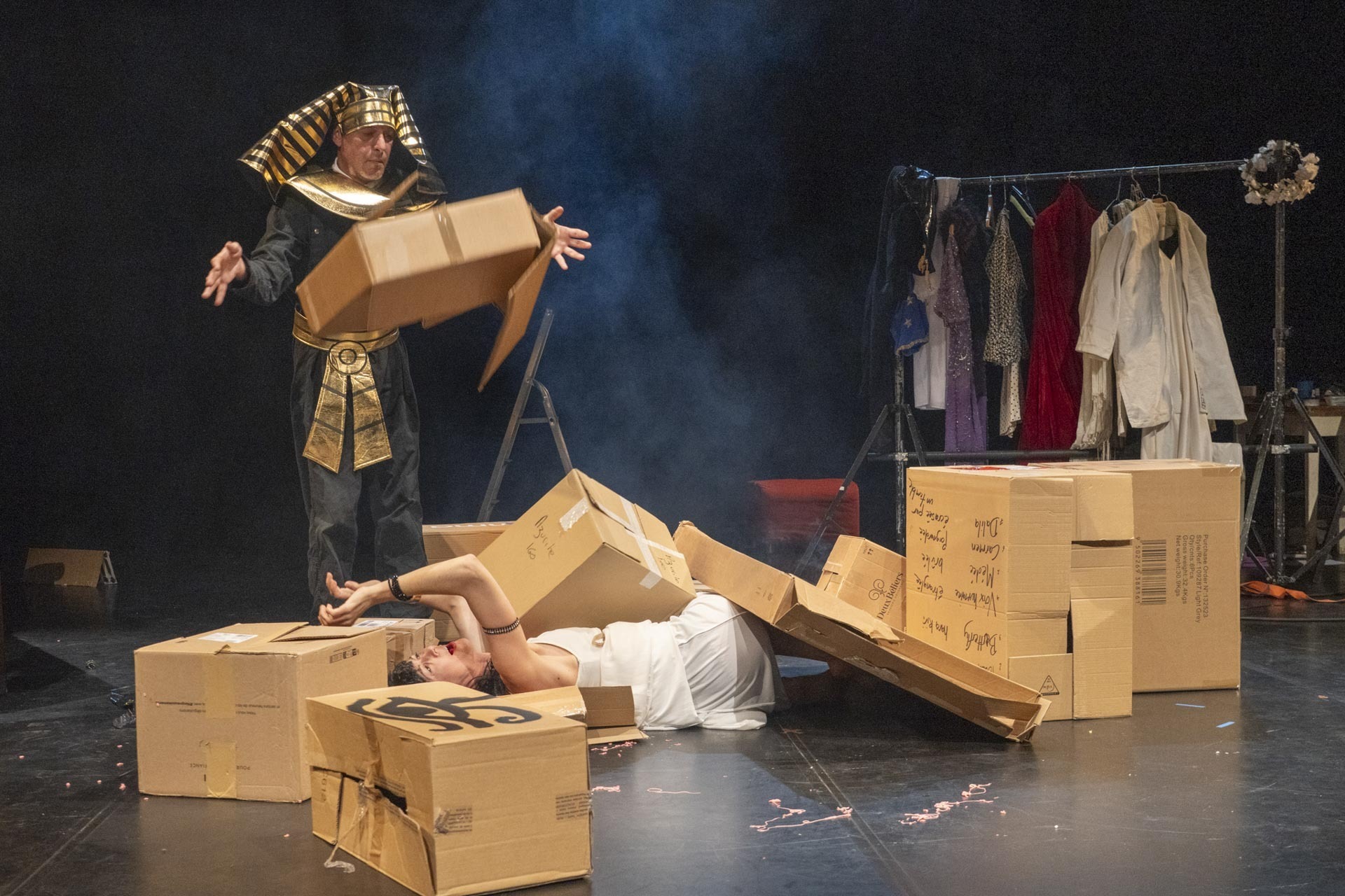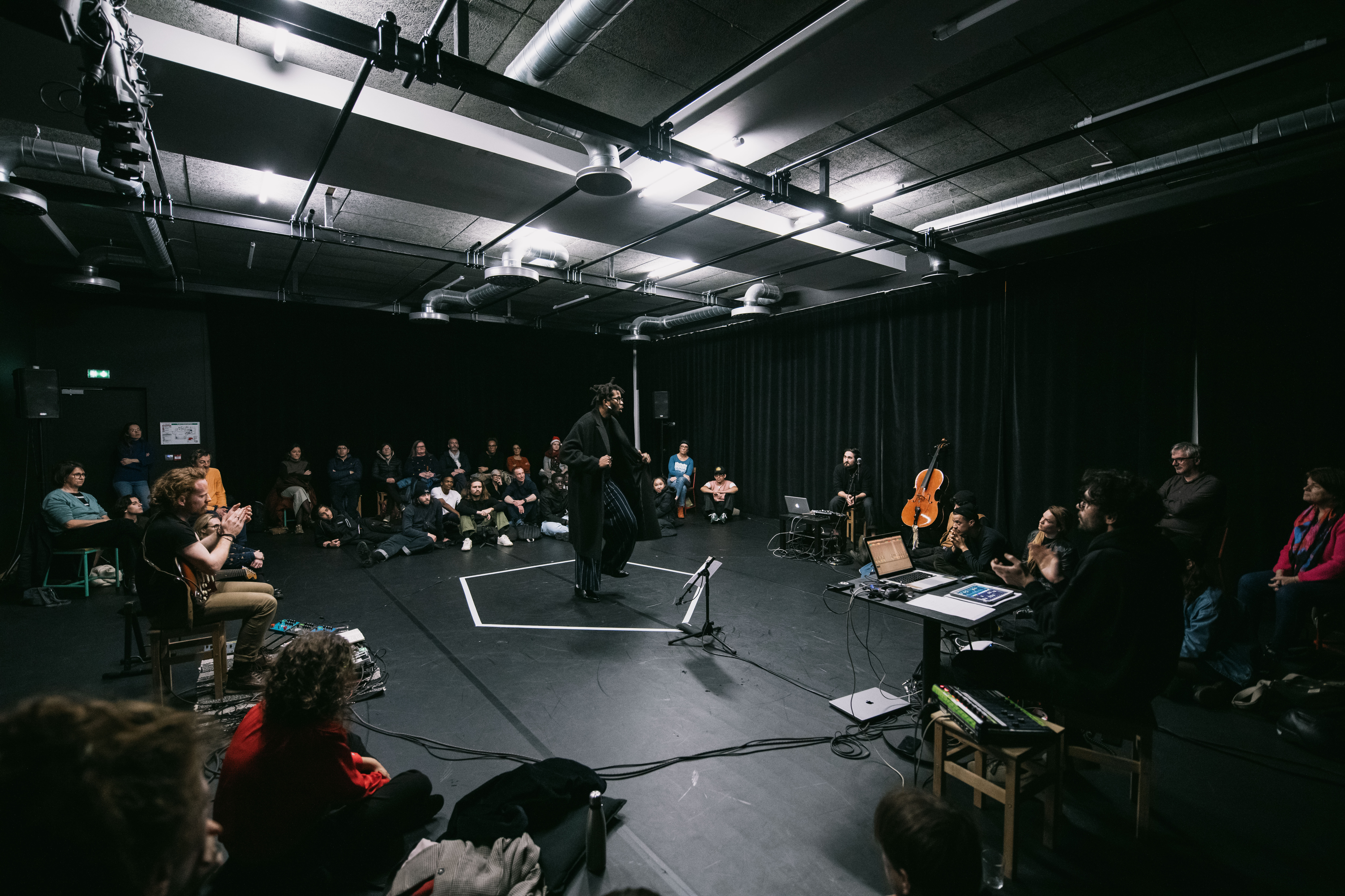 Suspendu et en balancement, l’instrument réagit aux appuis, aux déplacements et aux variations de tension du corps. Les cordes produisent des vibrations captées et diffusées dans l’espace : ici, le son naît directement du geste et le danseur devient interprète et moteur de l'instrument.
