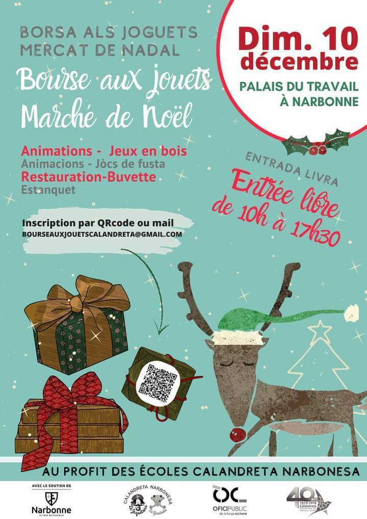 A quelques jours des fêtes de fin d'année, nous vous invitons à visiter ou à exposer à la bourse aux jouets organisée par les écoles Calandreta de Narbonne ! Plusieurs animations pour les plus jeunes sont proposées et vous pourrez vous restaurer sur place !