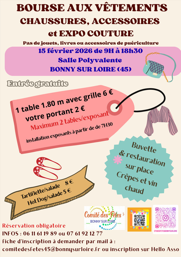 BOURSE AUX VÊTEMENTS et EXPO-COUTURE le dimanche 15 février 2026 à BONNY SUR LOIRE (45)