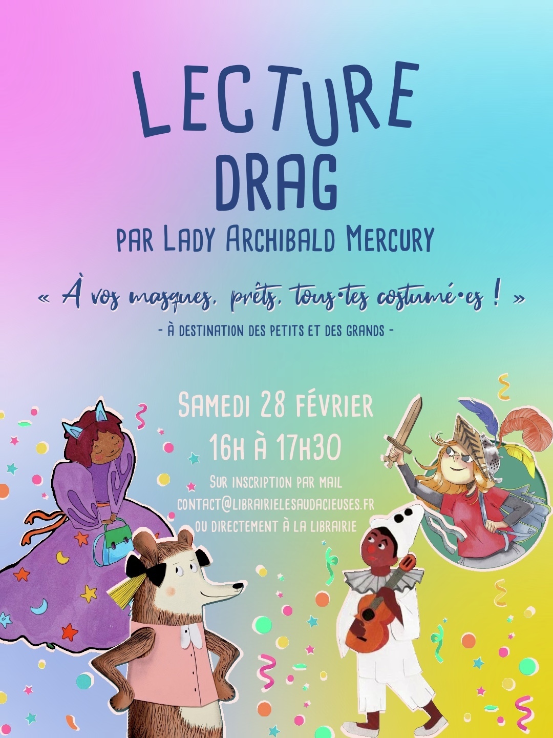 Et comme on veut vous prévoir une soirée inoubliable, on vous propose la toute première lecture drag à la librairie, orchestrée par Lady Archibald Mercury, sur le thème "D'amour ou d'amitié" (vous avez la réf ?). On célébrera les liens amoureux et amicaux, et tout ce qu'ils suscitent en nous, à travers une sélection de textes.