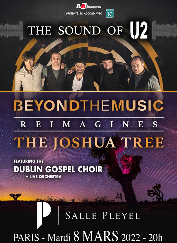 Mesdames, Messieurs, Le spectacle BEYOND THE MUSIC Reimagines The Joshua Tree - tournée THE SOUND OF U2, qui devait avoir lieu le 8 mars 2022, est reporté au 3 mars 2023. Les protocoles COVID-19 mis en place par le gouvernement, ne nous permettant pas de circuler librement avec des artistes étrangers sur le territoire français, nous avons été obligés d'anticiper le report de la tournée, malgré un contexte sanitaire qui s'améliore en France, ne sachant pas si les artistes pourraient venir en mars 2022. Les billets en votre possession resteront valables pour la date de report. Vous garderez le même placement. Beyond The Music, groupe Irlandais, est né de l'idée d'honorer les plus grands albums des plus grands artistes et de la volonté d'embellir les titres emblématiques du rock, grâce à des arrangements orchestraux fins, tout en restant fidèle aux morceaux d'origine. C'est un voyage musical et une reconnaissance pour les albums des plus grands artistes et leurs chansons qui ont contribué à façonner nos générations. Leur premier projet a été d'aller au-delà de la musique (Beyond The Music) de l'album révolutionnaire de U2 “The Joshua Tree”. Toutes les orchestrations ont été arrangées et enregistrées avec le Prague FILMharmonic Orchestra, plusieurs fois primé, dans un premier album intitulé « Beyond The Music – Perform The Joshua Tree ». Sur scène, le chanteur, Nigel Connell, et son groupe rendent hommage à ce puissant album qu'est “The Joshua Tree accompagnés d'un orchestre à cordes de 12 musiciens et de 10 choristes. N° téléphone accès PMR : 01 76 49 43 13