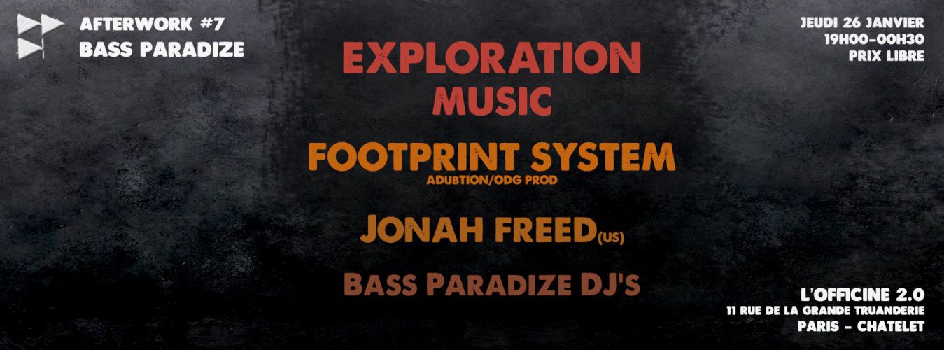 Afterwork sur 2 salles et à prix libre, on cède cette fois la salle du haut au collectif et label Exploration Music dont on a fêté les 8 ans tout récemment. Puis on conserve la formule Bass Music éclectique de la salle du bas avec FootPrint System, Jonah Freed fraîchement débarqué des US, et notre résident Hanuman Jr. Au programme donc :