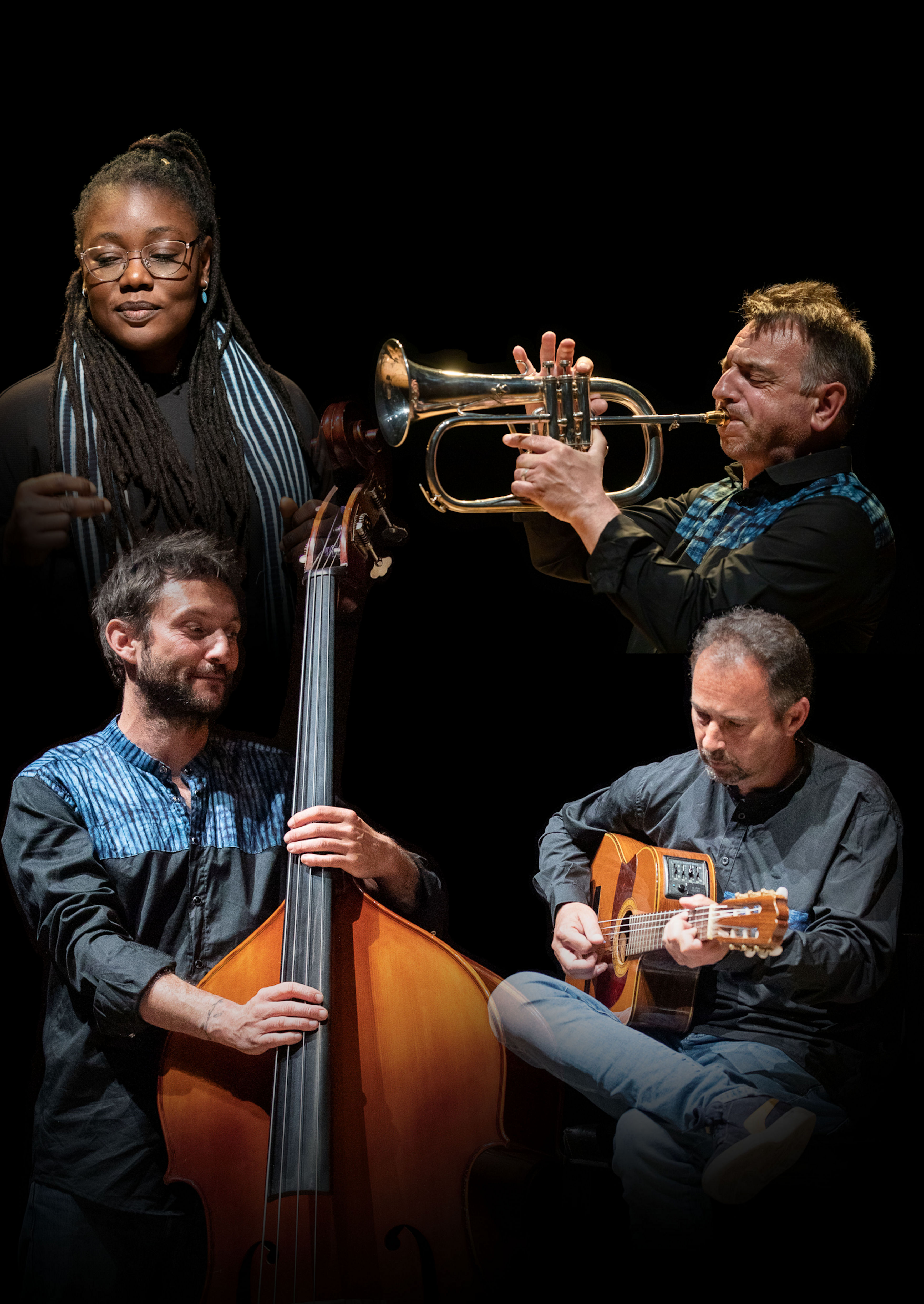 La musique du Quartet explore le dialogue entre la voix d’Aïcha et la trompette (ou bugle) de Philippe Champion. Compositeur, et trompettiste de jazz et des musiques improvisées, il a joué avec les plus grands musiciens de jazz, Steve Lacy, Rob Mazurek, Famoudou Don Moye, Ernest Dawkins…. Leader de son propre groupe le Lipazz Trio, il enseigne également au département jazz du Conservatoire de musique de Brest. Laurent Lannuzel (guitare) et Rémi Duranel (contrebasse), arpenteurs des scènes musiques de monde et jazz, assurent la partie rythmique et le groove du quartet.