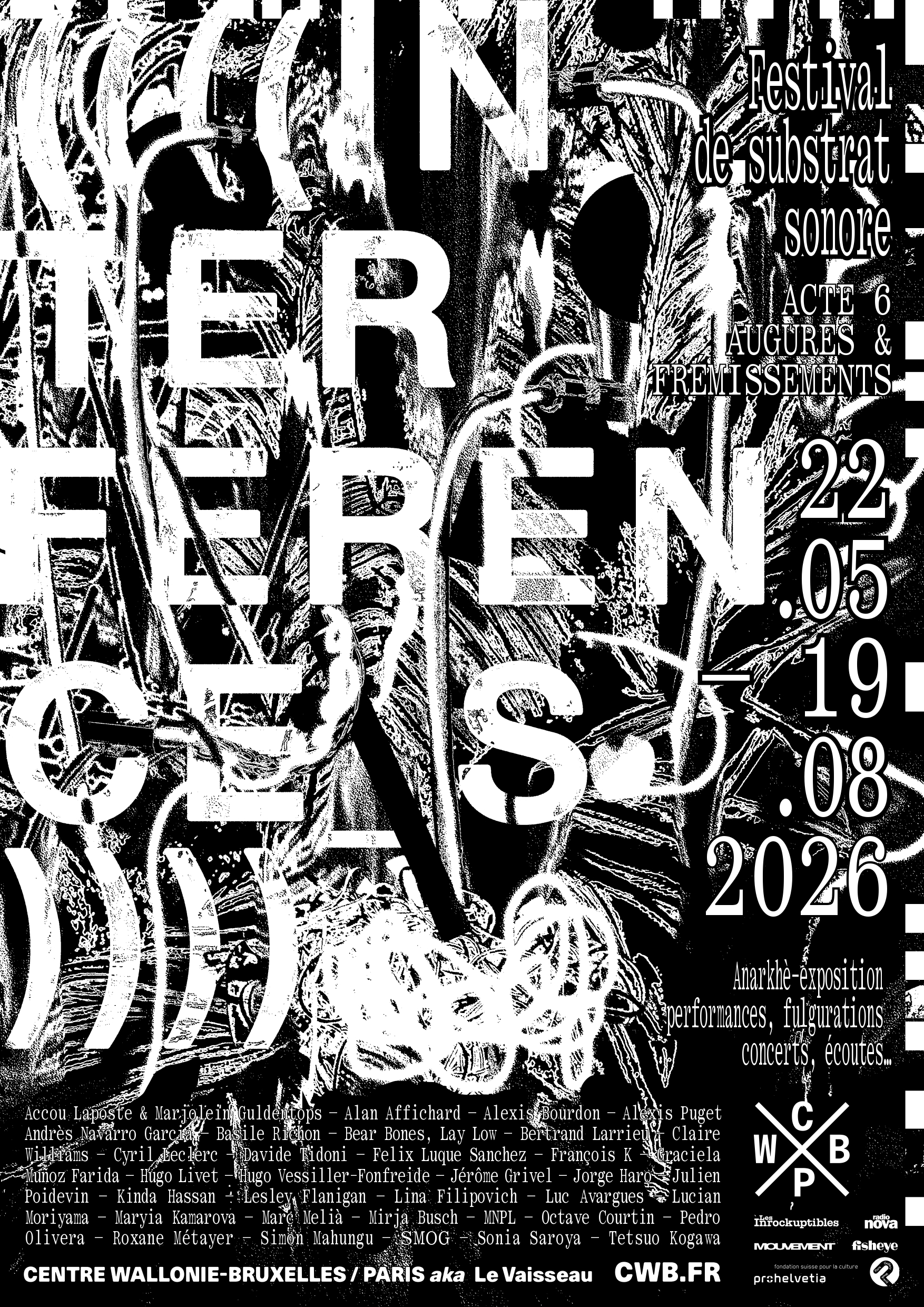 Le festival ((((INTERFERENCE_S)))) _ festival de substrat sonore _ se fait l’étendard de recherches qui s’auto-différencient, s’auto-éditent - un festival de l’imprédictible, du décodage, porté par des artistes limier.e.s de réalités enfouies et de sonorités insoupçonnées.