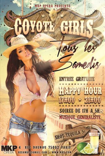 Tous les Samedis, les coyotes girls sinvitent au MKP pour vous faire vivre une soirée unique de 17h à 5h ! Happy hour prolongé jusquà 21h, shooters de Téquila, cocktails flambés et bar enflammé, sortez de votre routine et venez vivre une soirée digne des plus grands films de western ! Les filles, participer à lélection de « Miss Coyote » pendant la soirée et tentez de remporter une bouteille de champagne ! Dès 00h00, DJ et surprises pour vous faire danser jusquau bout de la nuit.
