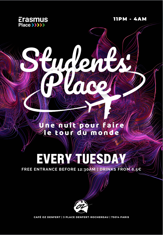 Concept ? Bienvenue a notre rendez-vous étudiant et international des mardis. Notre concept faire un tour du monde en une nuit. 24 à 30 nationalités seront présent. Qui peut participer ? Entre dans le game pour les 18 à 77 ans, nous sommes ouvert à tous. C'est ou ? Le Café OZ Denfert. Situé sur la place Denfert Rochereau, il est le plus connu des Cafés Oz. 3 dance floors et un bar extérieur, “pump up the volume”. Comment ça se passe ? Entrée gratuite avant 00:30 Free entrance before 00:30 Ingresso gratuito prima 00:30 Les consommation sont à partir de 6,50 € ex : (Pinte de bière - avec une carte étudiante). Horaires : 23h - 4h Quel est le style musical ? On reste Electro, RNB, Reggaeton, Pop, Disco, rien que pour toi ! Y a-t-il besoin d’une tenue particulière ? Pas besoin de ta robe de Cendrillon ou de ton smoking. Décontracte. Mais, n’oublie pas que : « Plus tu es beau, plus tu plaît ». Amis sportif, laisse ta tenue au vestiaire. Qu'est-ce qu'il ne faut pas faire ? ❌ Venir sans sa pièce d'identité. ❌ Merci de ne pas consommer d'alcool devant l'entrée du club. ❌ Les pièces d'identité photocopier ou présenté par téléphone ne sont plus accepter. Comment puis-je avoir plus d'informations ? Infoline/résa mail : [email protected] Tel : 06 95 41 16 48