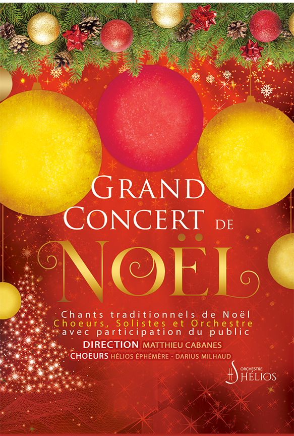 Grand Concert de Chants Traditionnels de Noël Grand Concert de Noël Chants Traditionnels Solistes, Chœurs, Orchestre Symphonique et participation du Public « We Wish you a Merry Christmas » (Britanique), « Mon beau Sapin, roi des Forêts » (Allemand) « Il est né le divin enfant » (Français), « Les anges dans nos campagnes » (Français), “La Marche des Rois” de Bizet, « Joy to the World » de Haendel, « Hark the Herald Angels Sing » de Mendelsshon, « Jingle Bells » de James Pierpont , «Minuit Chrétien » de Adolphe Adam, «Douce Nuit » de Franz Gruber , « Petit Papa Noël » de Henri Martinet , « Ave Maria » de Charles Gounod, « Entre le bœuf et l’âne gris » de François Gevaert, « Hymne à la Nuit » de Rameau, « Adeste Fideles » de John Francis Wade, « Ave Maria » de Camille Saint-Saëns, « Jésus, que ma joie demeure » de Bach, « L’adieu des bergers » de Hector Berlioz, « Duo des Fleurs » Lakmé, « Es ist ein Ros’ entsprungen » Oratorio de Camille Saint-Saëns, Tollite Hostias de Camille Saint-Saëns Orchestre Hélios Dynamique et éclectique, l’orchestre Hélios s’est imposé depuis sa création en 2014. Son directeur artistique, Paul Savalle, favorise l’insertion professionnelle des jeunes musiciens par la pratique d’orchestre. Ainsi, de jeunes diplômés se mêlent aux musiciens d’orchestre, aux chefs et aux solistes expérimentés, dans des conditions de travail optimales. De la musique baroque à la musique contemporaine, les programmes sont variés, le répertoire est à la fois symphonique et choral, l’orchestre s’associant aux chœurs départementaux et régionaux. Grâce à la collaboration avec différents chefs, les musiciens abordent un répertoire très riche en élargissant leur palette d’interprétation. Ils sont tous issus des grands conservatoires français, certains appartenant à un orchestre national. Du quatuor à cordes à l’orchestre symphonique, en passant par l’ensemble de cuivres, l’orchestre élargit toujours son audience en modulant sa composition. La formation « cordes » se produit dans les plus prestigieuses églises de Paris, ce qui permet au public de découvrir un patrimoine architectural très riche. Sa formation à géométrie variable permet à l’orchestre Hélios d’aborder un répertoire très large avec une curiosité passionnée.