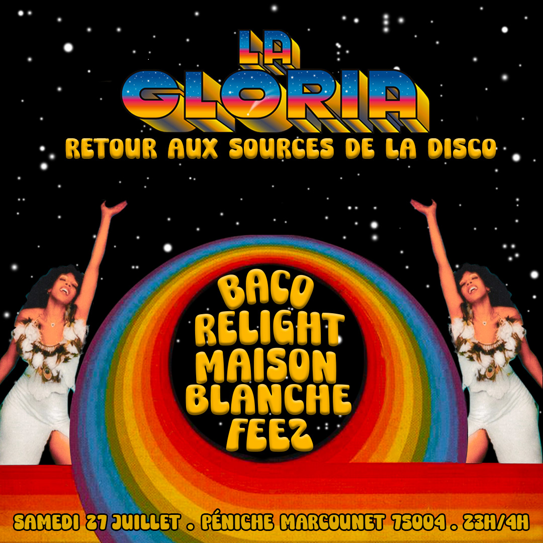 Pendant les JO, la Gloria investit la péniche Marcounet (au centre de Paris) du 27 juillet au 10 août pour te proposer 3 soirées Disco (les samedis) et 2 soirées House (les vendredis). Dans ce lieu intimiste et chaleureux, nous célébrerons à nouveau la magie de la Disco et de la House. Tu pourras venir profiter de l’immense terrasse. La Gloria et ses artistes se chargeront de t’emmener au bout de la nuit dans un univers groovy et chaleureux.