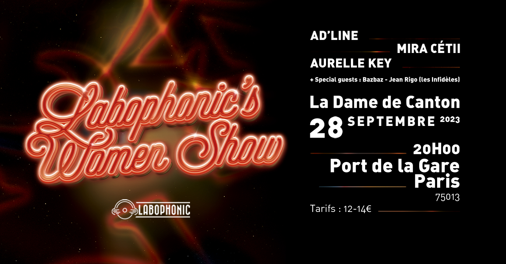 Après plusieurs éditions dans le Grand Est (Strasbourg, Epinal, Saint-Dié), le Labophonic's Women Show débarque à Paris le 28 septembre 2023 à la Dame de Canton pour un spectacle autour des artistes féminines du label indépendant Labophonic.
