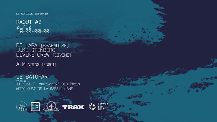 Après un début en grande pompe, Le Gorille remet ça pour le Raout n°2 ! Cette fois ça se passe au Batofar le 21 décembre. Et ce jeudi, l’expérience sera totale ! Djing, Vjing et expositions d’artistes qui nous sont chers, tout est prévu pour vous en mettre plein la vue et plein les oreilles, c’est promis.