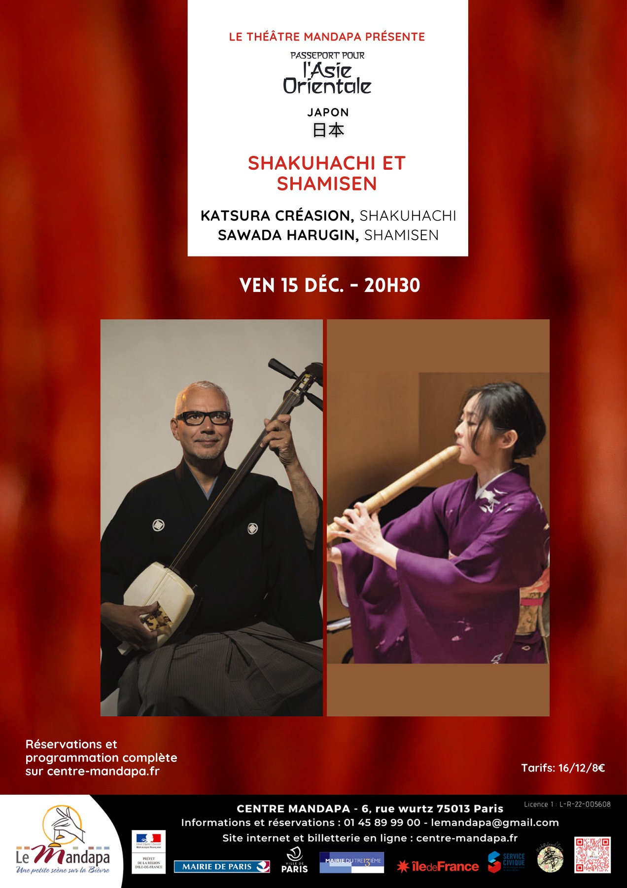 Tarif réduit : 12€ - Moins de 15 ans : 8€ - Plein tarif : 16€