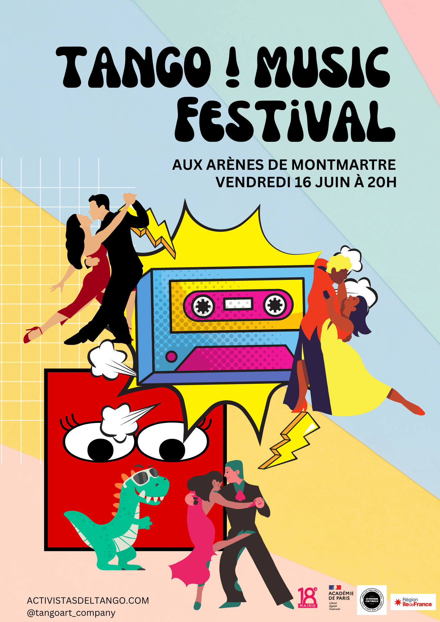 Si on vous dit Tango, musique et Arènes de Montmartre... cela vous tente ? Dans le cadre des olympiades culturelles organisées par Paris et avec le soutien de la région Île-de-France, la Tangoart company a le plaisir de fouler le sol des Arènes de Montmartre le vendredi 16 juin ! Dans une ambiance intimiste et privilégiée, en plein coeur de Paris, venez nous retrouver pour une soirée festive d'animation artistique autour de l'histoire musicale et dansée du tango. Le concert sera précédé d’une initiation gratuite à la danse du tango argentin comprise dans le prix du billet. Une occasion festive de faire ses premiers pas de tango dans un cadre inoubliable. ARTITES INVITÉS pour cette première édition : Pablo Gignoli & Tangoart Company. INFOS PRATIQUES : ? : Le 16 juin 2023 ?: Aux Arènes de Montmartre (25 Rue Chappe, 75018 Paris) ⏰ : 20 H Nous sommes impatients de vous y retrouver ? Cet événement s'inscrit dans le programme d'activité du projet Tango en Olympe qui a reçu le soutien de : FDVA - fond de développement de la vie associative -, DRAJES Île-de-France et de l'Olympiade culturelle - été culturel portés par la région Île-de-France. Dans le cadre de l'Olympiade culturelle et de l’été culturel 2023, TANGO EN OLYMPE met en avant les piliers que partagent le monde de la danse et celui du sport: esprit d’équipe, dépassement de soi, précision des mouvements et défend également des valeurs importantes dans le monde du sport et qui méritent qu'on s'engage pour elle : la tolérance, l'ouverture à l'autre, l'inclusivité