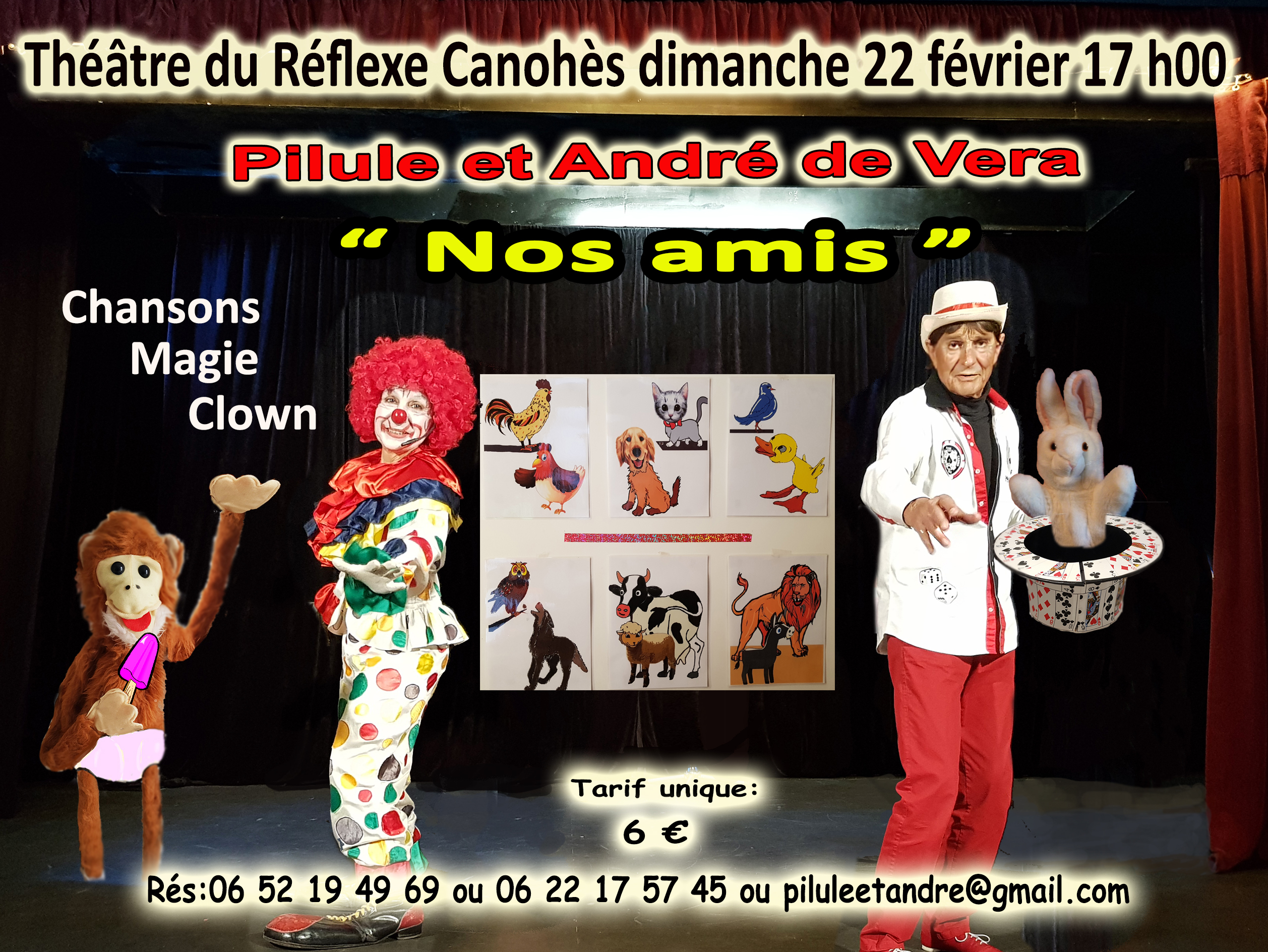 Pilule et André de Vera un joyeux spectacle interactif pour enfants de 2 à 6 ans sous forme de comédie musicale, chansons, magie, clown, ventriloquie