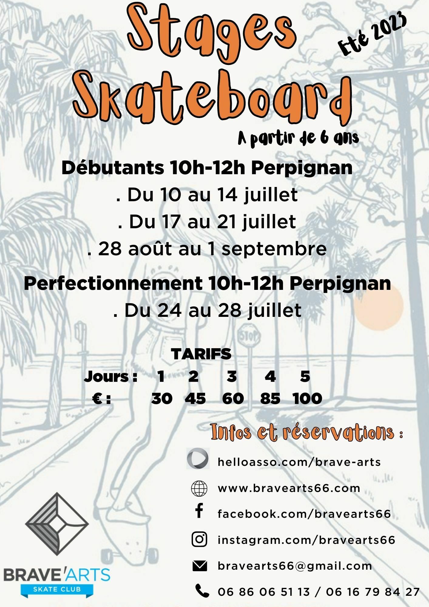 Stage débutants Skateboard du 17 au 21 juillet 2023 de 10h à 12h au skatepark du Moulin à Vent à Perpignan. A partir de 6 ans Possibilité de prêt de matériel