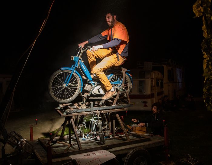 Réincarnée dans une pompe à essence gigotante, la Grand-Tatie Vévette, aidée par ses neveux bricoleurs et musiciens, va faire revivre aux spectateurs ses voyages à mobylette. Durant cette fumeuse expérience sensorielle, musicale et visuelle, des cobayes choisis dans le public viendront chevaucher un simulateur de conduite relié à un capteur très particulier. Les pilotes devront accumuler assez d'énergie pour libérer Tatie de sa carcasse, qu'elle puisse enfin s'envoler et rejoindre son Lulu. En partenariat avec le FAB: Festival des Arts de Bordeaux Metropole