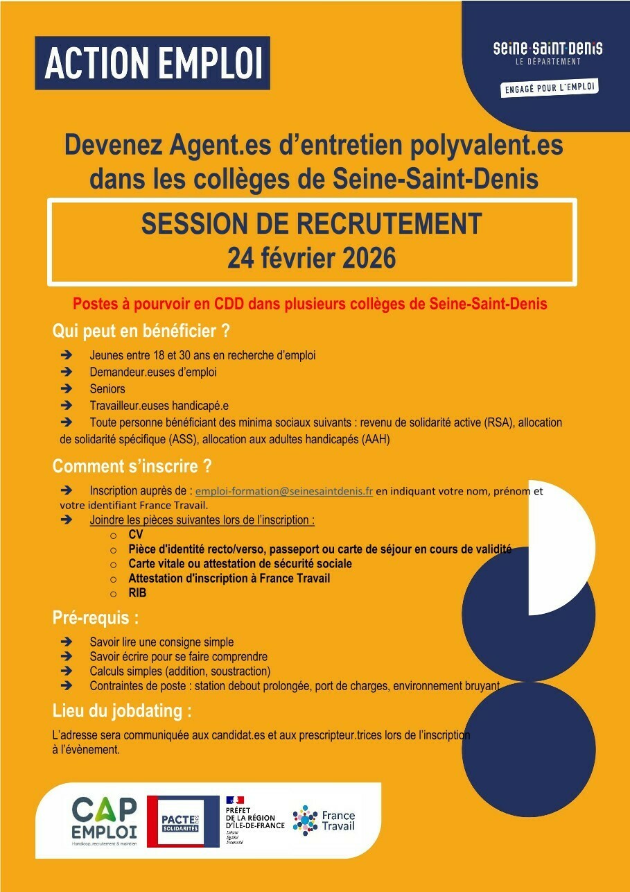 Session de recrutement agent d'entretien polyvalent dans les collèges de Seine Saint Denis le 24 Février