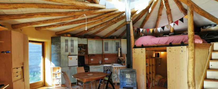 Visite d'une Paillourte : maison en paille porteuse, ronde, charpente réciproque, enduit terre, fondation pierre...