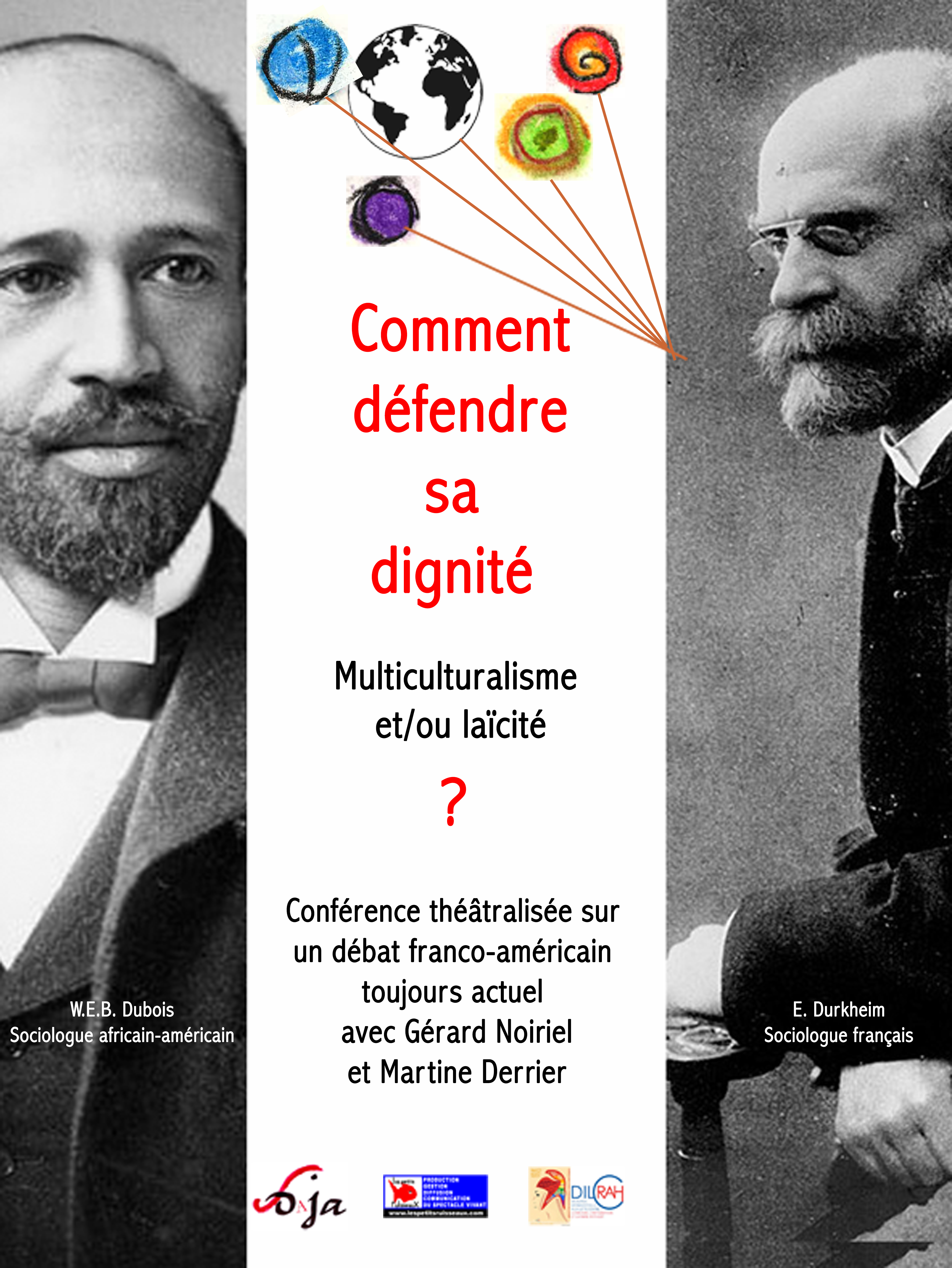 Nous proposons une conférence théâtralisée de Gérard Noiriel Directeur d'Etude à l'Ehess. Il est accompagné de Martine Derrier qui rend la proposition ludique grâce à des saynètes théâtrales, des personnages joués, des montages audiovisuels, des marionnettes. Nous nous adressons aux jeunes lycéens sur leurs temps scolaires et extra scolaires afin d'affirmer et de promouvoir le vivre ensemble, la fraternité et la lutte contre les discriminations par l'apport de connaissances historiques, sociales et philosophiques. Cette conférence théâtralisée aborde deux formes majeures de discrimination que sont l'antisémitisme et le racisme à l'encontre des Noirs en mettant en scène deux grands sociologues qui ont été eux-mêmes victimes de ces discriminations : Emile Durkheim et W.E.B. Du Bois. Comme tous deux ont participé à l'exposition universelle de Paris en 1900, l'action du spectacle se situe dans ce cadre pour montrer comment ces deux savants ont joué un rôle essentiel dans la fondation de la sociologie de leur pays respectif (la France et les USA) Ils ont proposé ainsi une réflexion et des mesures concrètes pour combattre les discriminations. Le but est de montrer au public que la connaissance peut être un moyen de défendre sa dignité tout en respectant les autres. La conférence permet aussi d'expliquer ce qu'on appelle le « multiculturalisme » et comment on peut le concilier avec les principes de la laïcité.