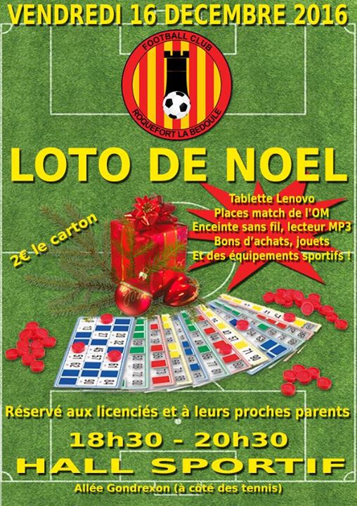 Nous avons le plaisir de vous convier au loto de Noël du FCRB, le vendredi 16 décembre 2016 à 18h30 au Hall Sportif (à côté des tennis).