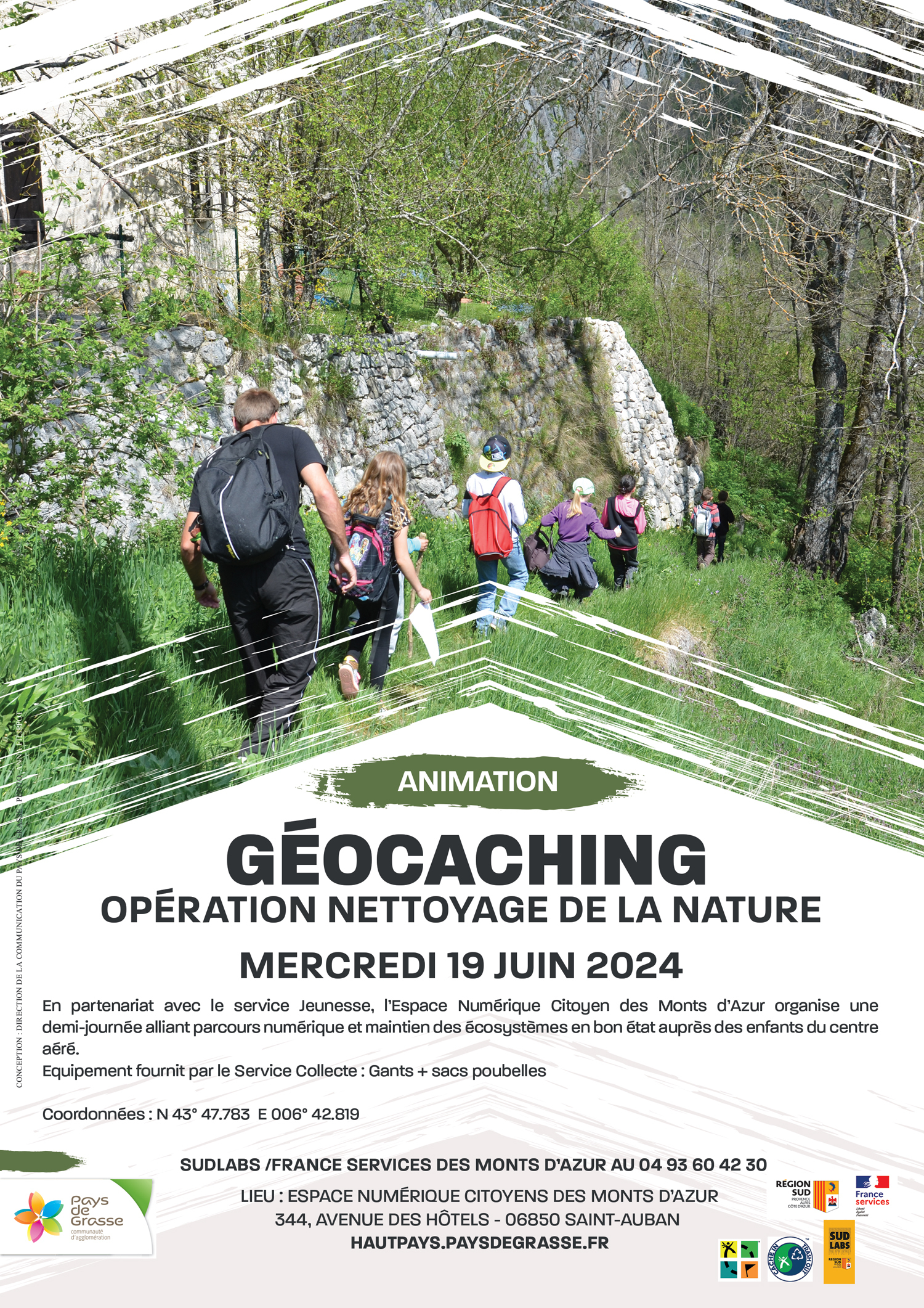 En partenariat avec les services jeunesse et Collecte, l'Espace Numérique Citoyen des Monts d'Azur organise une demi-journée nettoyage de la Nature à travers un geocaching qui valorisera les patrimoines naturel et culturel d'une commune. Les coordonnées du parcours numérique seront données le jour même. Animation réservée uniquement au public du service jeunesse Action soutenue par la Région PACA Lieu : ENC des Monts d'Azur - 344, avenue des Hôtels - 06850 Saint-Auban /04.93.60.42.30