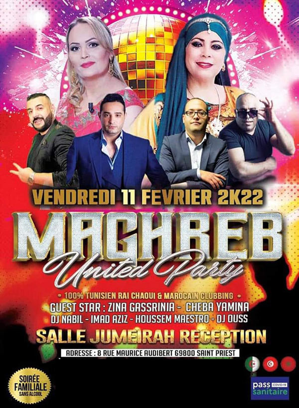 MAGHREB United Party a Lyon 100%TUNISIEN – RAI – CHAOUI – MAROCAIN - CLUBBING ZINA GASSRINIA – CHEBA YAMINA – IMAD AZIZ DJ OUSS & DJ NABIL ÉVÉNEMENT A NE PAS MANQUER AMBIANCE GARANTIE SOIRÉE FAMILIALE ET SANS ALCOOL BILLETTERIE /PLACE MINUTE FNAC PASS SANITAIRE ET DANS LE RESPECT DES GESTE BARRIÈRES. Salle JUMEIRAH RECEPTION 8 Rue Maurice Audibert 69800 Saint Priest INFOLINE 0753642416