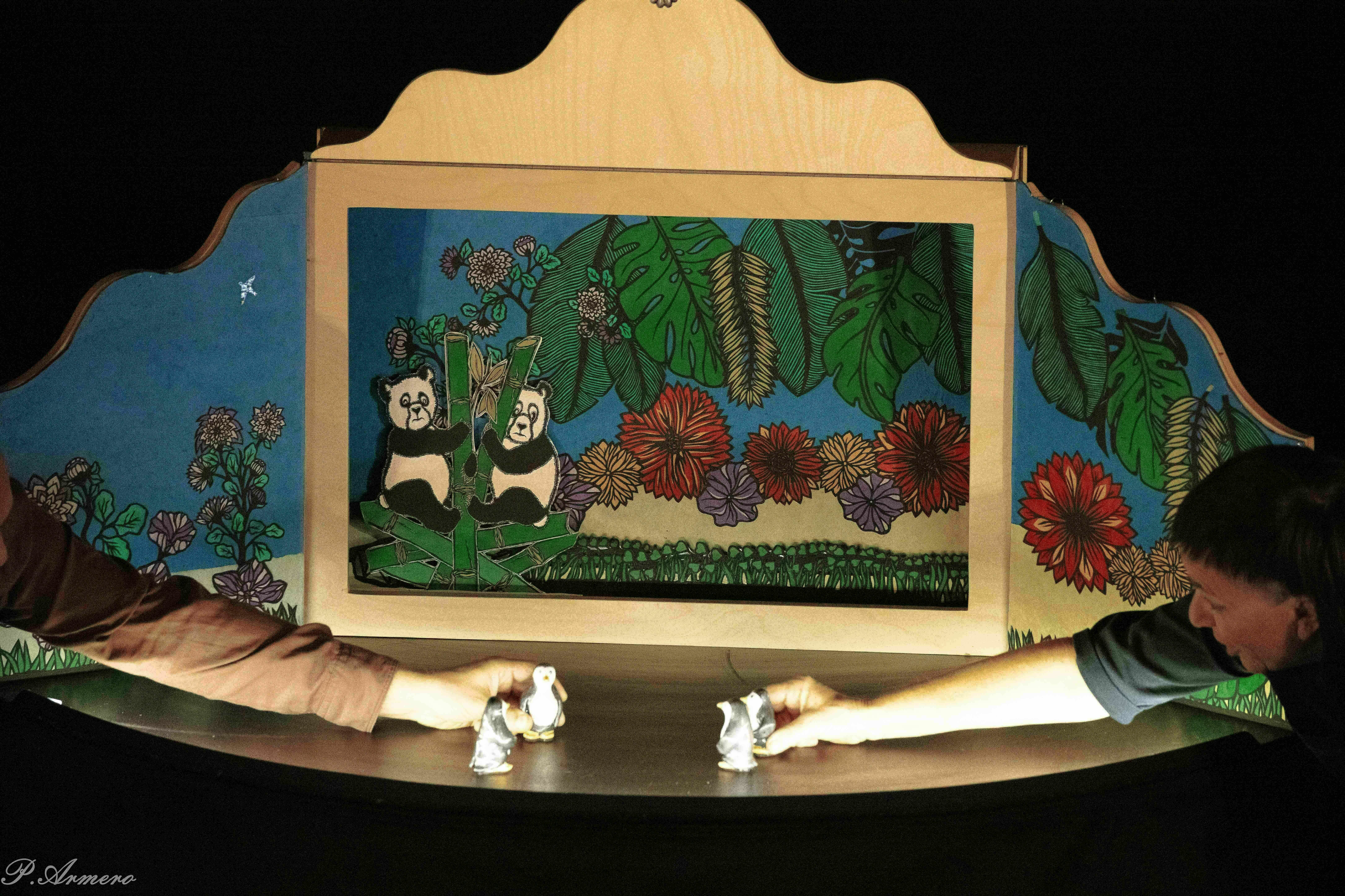 Le kamishibaï, petit théâtre d’images que la conteuse dévoile au fur et à mesure de l’histoire. Parfois de petites marionnettes se glissent et s’animent entre les illustrations. Un musicien accompagne le conte en musique et bruitages.