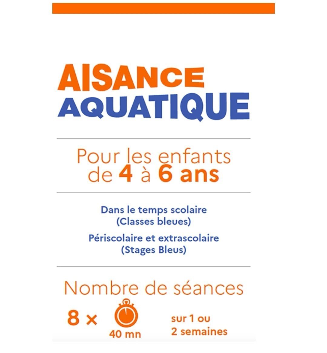 Familiarisation au milieu aquatique pour les enfants de 4 à 6 ans, sous forme de stage de 8 séances du lundi au vendredi sauf le mercredi, par l'association SOSN.