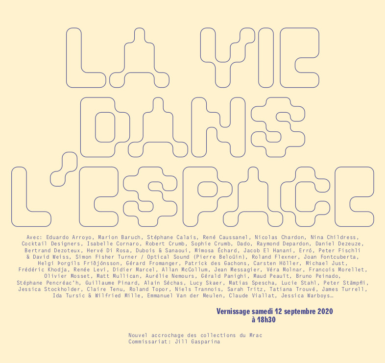 La vie dans l’espace est une exposition conçue comme un regard sur les collections du Mrac, revisitée à partir de principes d’accrochage empruntés à la recherche scientifique, au champ de la fiction, ou plus largement à l’imaginaire spatial.