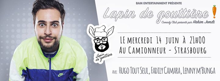 LAPIN DE GOUTTIÈRE, le nouveau comedy club de Strasbourg présenté par Hakimjemili ! Pour cette première, nous aurons le plaisir d'accueillir Fadily Camara, Hugo tout seul & @Lenny M'Bunga qui nous présenterons