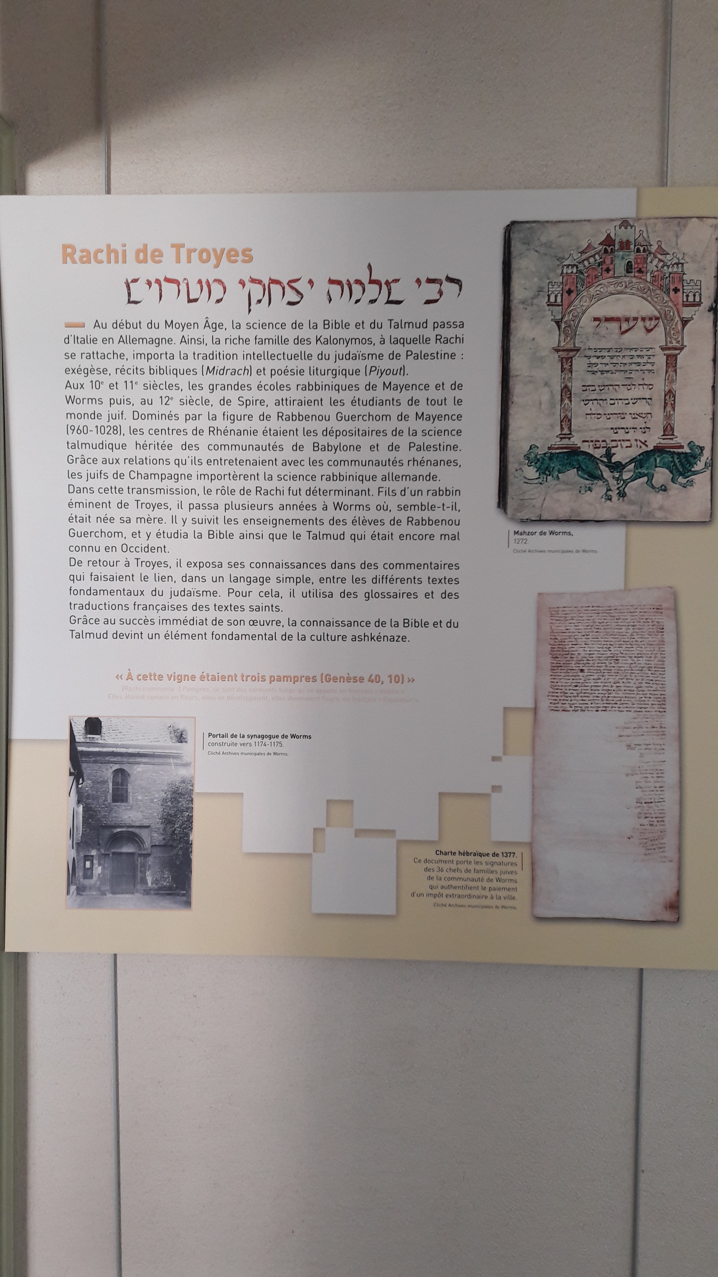 L'exposition présente des reproductions de manuscrits et de documents du Moyen Âge, ainsi qu'une introduction à la vie et l'oeuvre de Rachi depuis le contexte historique dans lequel il a vécu.