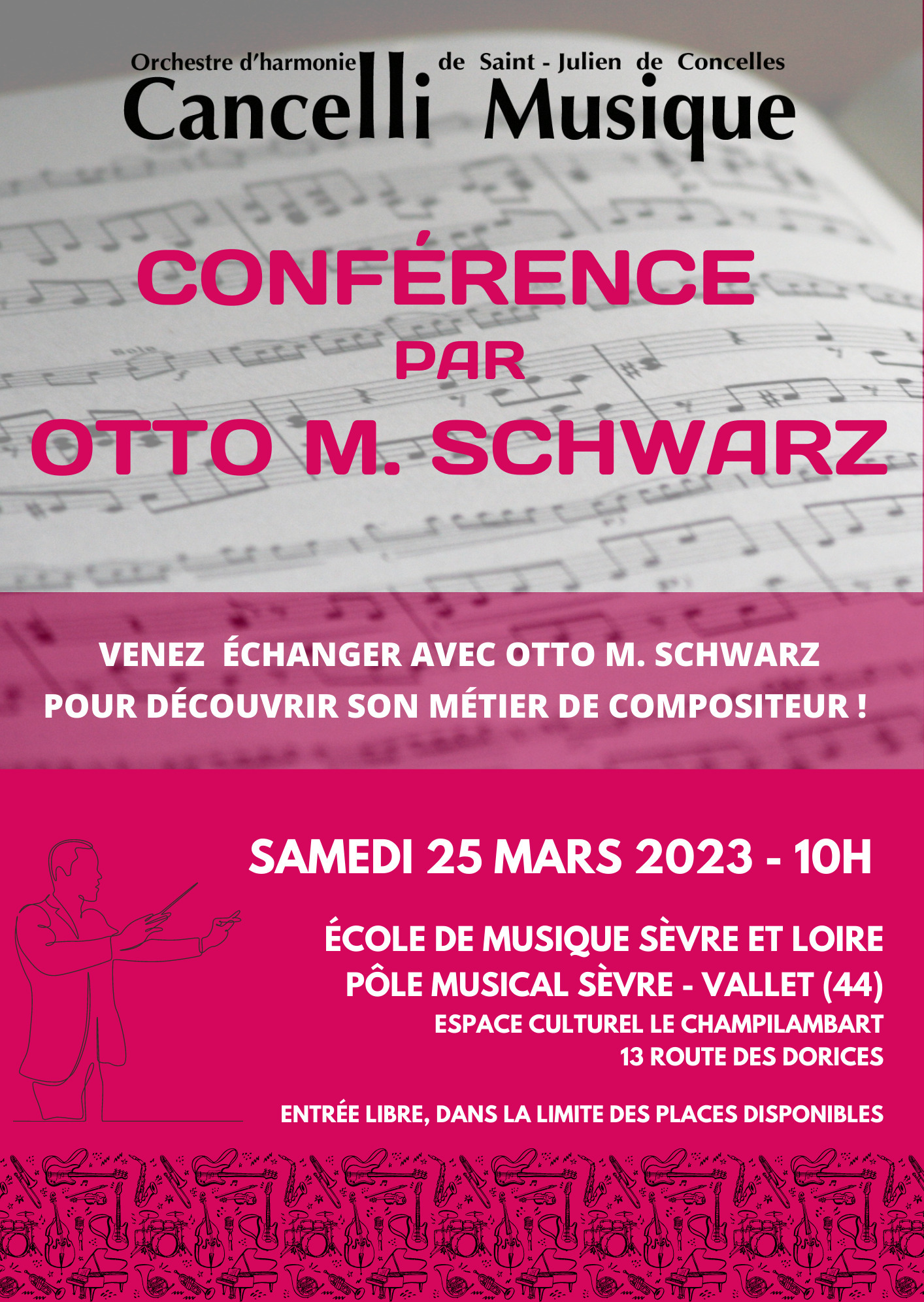 Conférence par le compositeur autrichien de musique pour orchestre d'harmonie Otto M. Schwarz. Avant son concert du lendemain dimanche 26 mars à 16h, le compositeur viendra expliquer son travail de composition, son inspiration, ses références auprès du public mélomane.