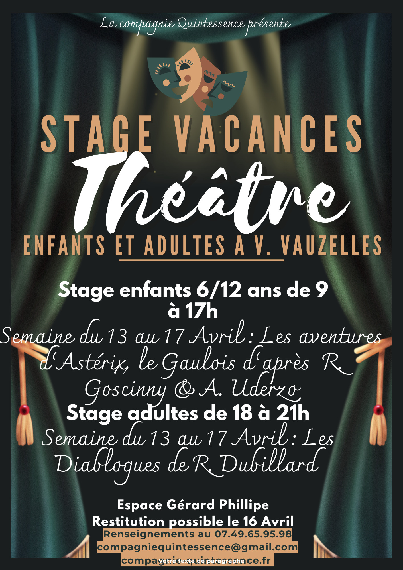 Offrez-vous un stage de théâtre ! À travers les œuvres drôles de Roland Dubillard, découvrez ou confirmez votre goût pour la scène en travaillant votre diction, votre prise de parole, vos émotions, votre créativité et votre esprit d'équipe. Au programme : des jeux théâtraux et des improvisations pour passer un moment convivial et enrichissant. Et bien sûr, la découverte ou redécouverte des textes de Rolland Dubillard