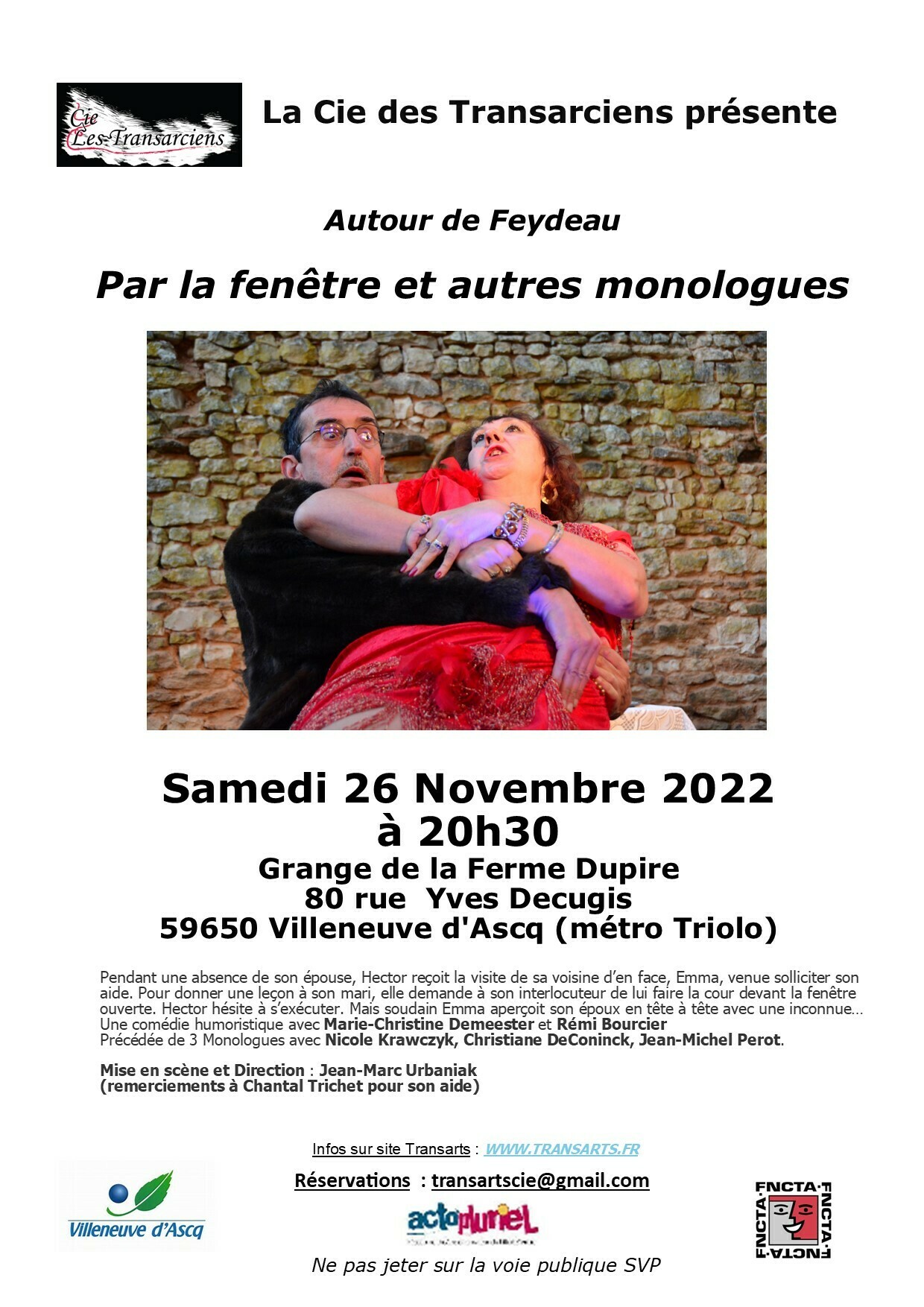 Pendant une absence de son épouse, Hector reçoit la visite de sa voisine d’en face, Emma, venue solliciter son aide. Pour donner une leçon à son mari, elle demande à son interlocuteur de lui faire la cour devant la fenêtre ouverte. Hector hésite à s’exécuter. Mais soudain Emma aperçoit son époux en tête à tête avec une inconnue… Une comédie humoristique avec Marie-Christine Demeester et Rémi Bourcier Précédée de 3 Monologues avec Nicole Krawczyk, Christiane DeConinck, Jean-Michel Perot.