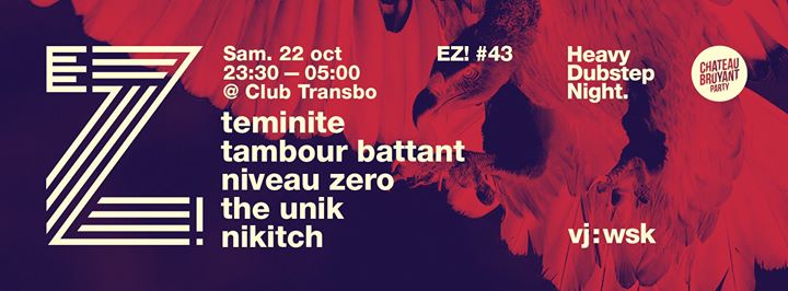 Déjà présent sur la EZ! #2 en 2011, sur la EZ! #18 avec Borgore et sur une CB Party en 2015, la clique du label CHATEAU BRUYANT débarque une nouvelle fois pour venir secouer Lyon. NIVEAU ZERO, TAMBOUR BATTANT, THE UNIK et NIKITCH, les 4 artistes du crew, arriveront comme à leur habitude, avec les bras chargés de nouveautés explosives, du Dubstep le plus filthy au Tropical le plus bouncy. Lourdeur, éclectisme, qualité et exaltation, voici les adjectifs qui résumeront à coup sûr la nuit à venir. Pour couronner le tout, le jeune prodige anglais TEMINITE se rajoute au line-up pour encore plus de plaisir.