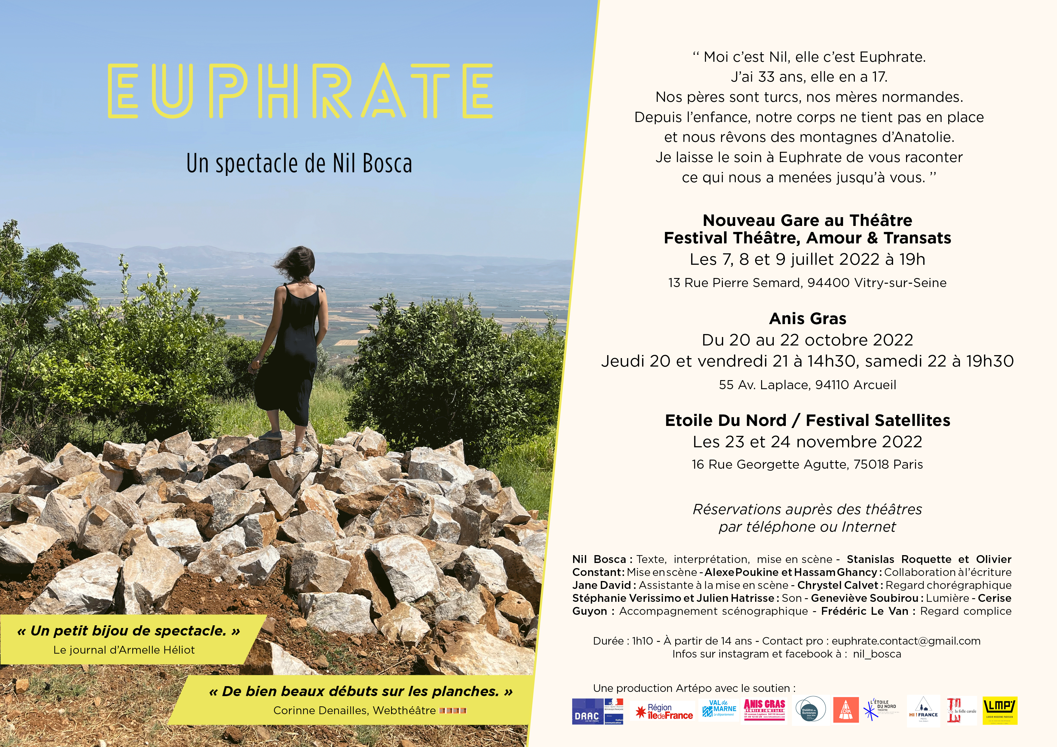 Soutiens : Anis Gras, le Théâtre de Suresnes Jean Vilar, LMP, l’ECAM, l’Abbaye du Reclus, le Nouveau Gare au Théâtre, l’Etoile du Nord, la Région Ile-de-France, le département du Val-de-Marne et la DRAC Ile-de-France.